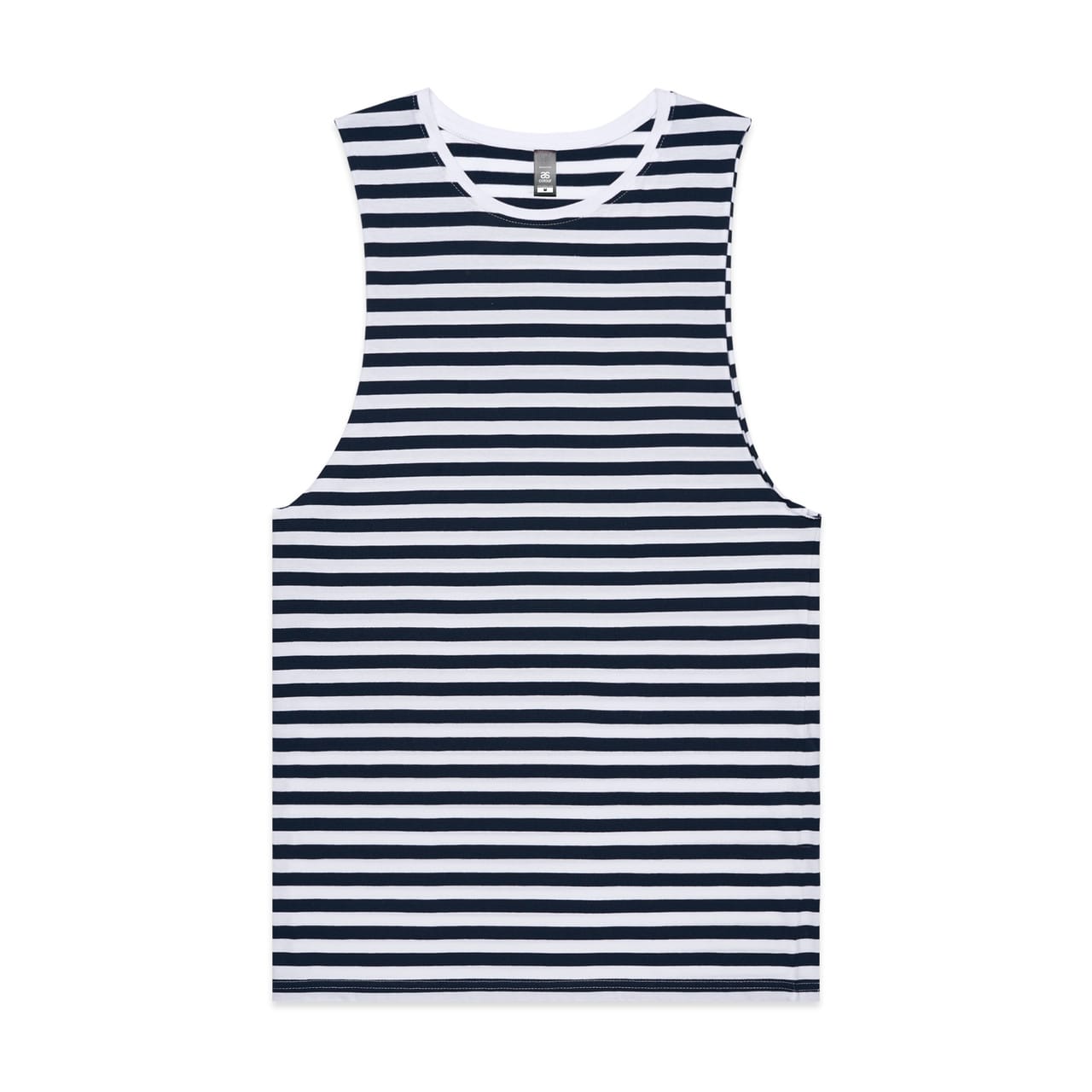 Sleeveless tank, raw armhole edges, varied stripe width across colours, neck ribbing, double needle bottom hem, preshrunk to minimise shrinkage