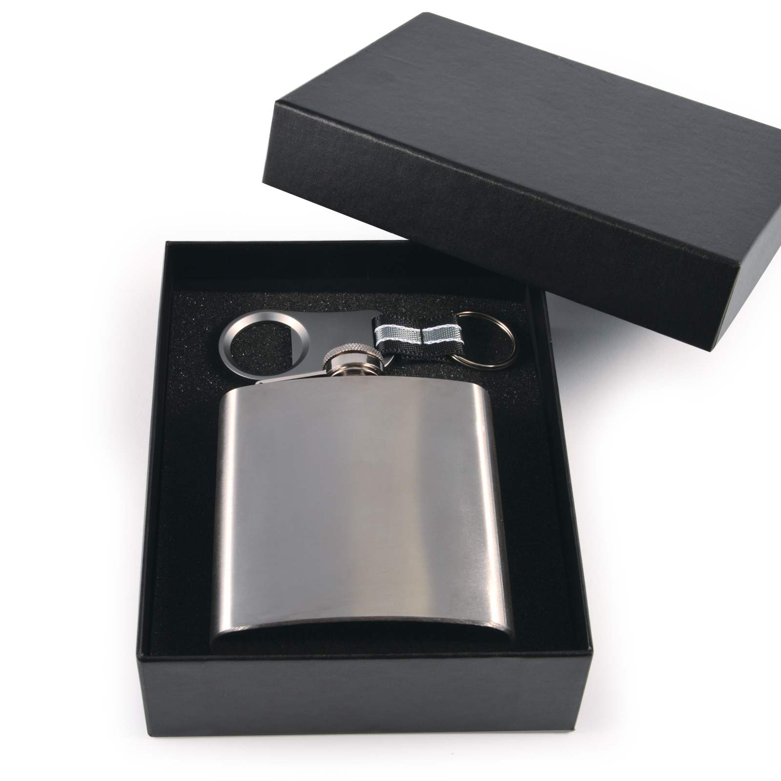Superior gift set of stainless steel hip flask and aluminium bottle opener with 30mm split ring keytag. Packed in 2 piece cardboard gift box with laser cut foam insert.