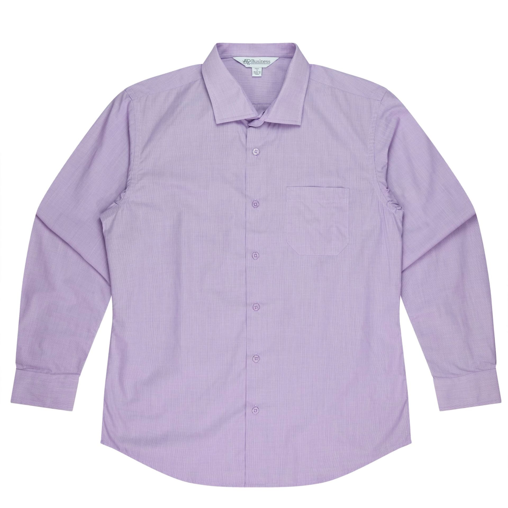 Style: 1902L Sizes: XXS-5XL Fabric: 65% Polyester 35% Cotton Features: This shirt features a doubled turned placket with an angle edge on the long sleeve cuffs. Back yoke with side comfort pleats. Anti-pilling treatment. 3 "micro-check" Colours: Shadow Grey, Mauve, Mid Blue