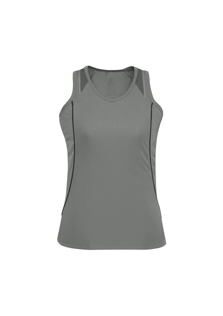 Features: Grid mesh underarm panels for breathability Unique shoulder print feature Contrast panels and piping V-Neck and armhole binding Racer back and shaped styling Fabric: 100% BIZ COOL™ Polyester Sports Interlock 155 GSM UPF rating - Excellent Sizes: 8 - 20