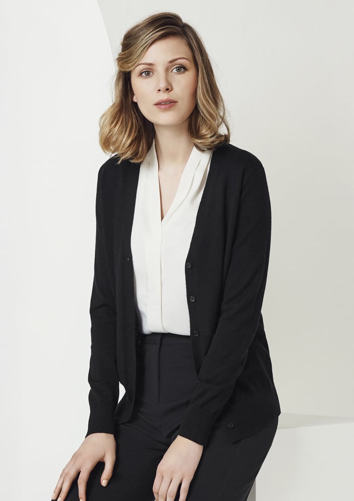 Features: Ladies modern button-through style, hip length with softly ribbed cuff and hem Fabric: 50% Merino Wool, 50% Acrylic - 14 Gauge Machine washable on wool setting Sizes: XS - 3XL