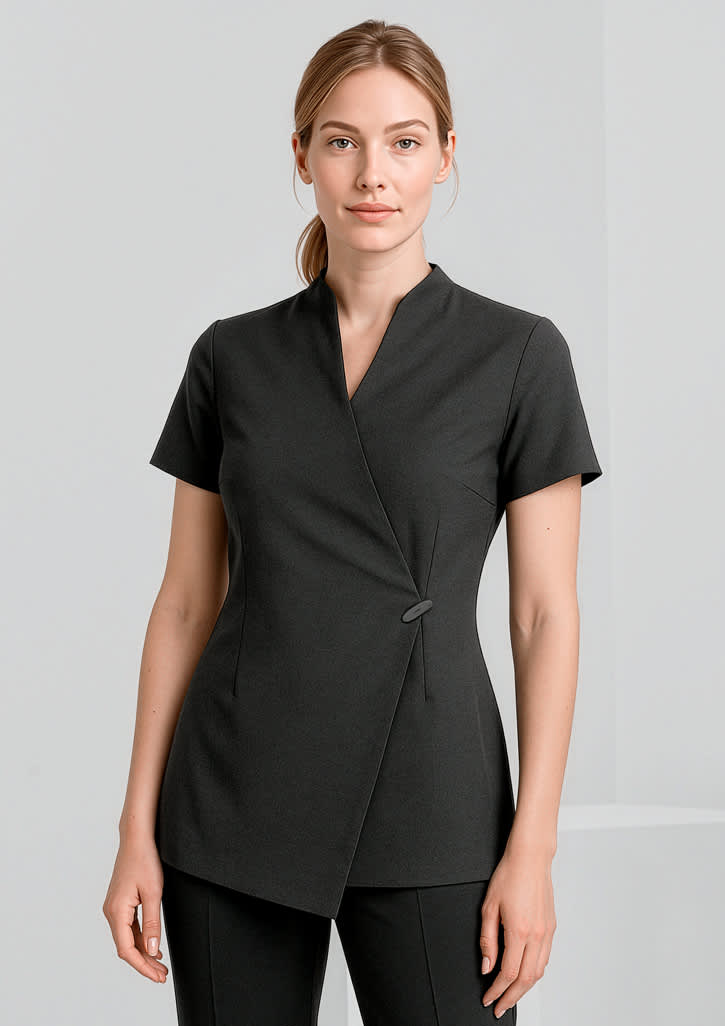 Features: Designer style, asymmetrical mock-wrap front Invisible centre back zip, deep side splits Fabric: 97% Polyester, 3% Elastane Premium stretch fabric with linen-like appearance Easy care, Dupont™ Teflon® stain release function Sizes: 6 - 20