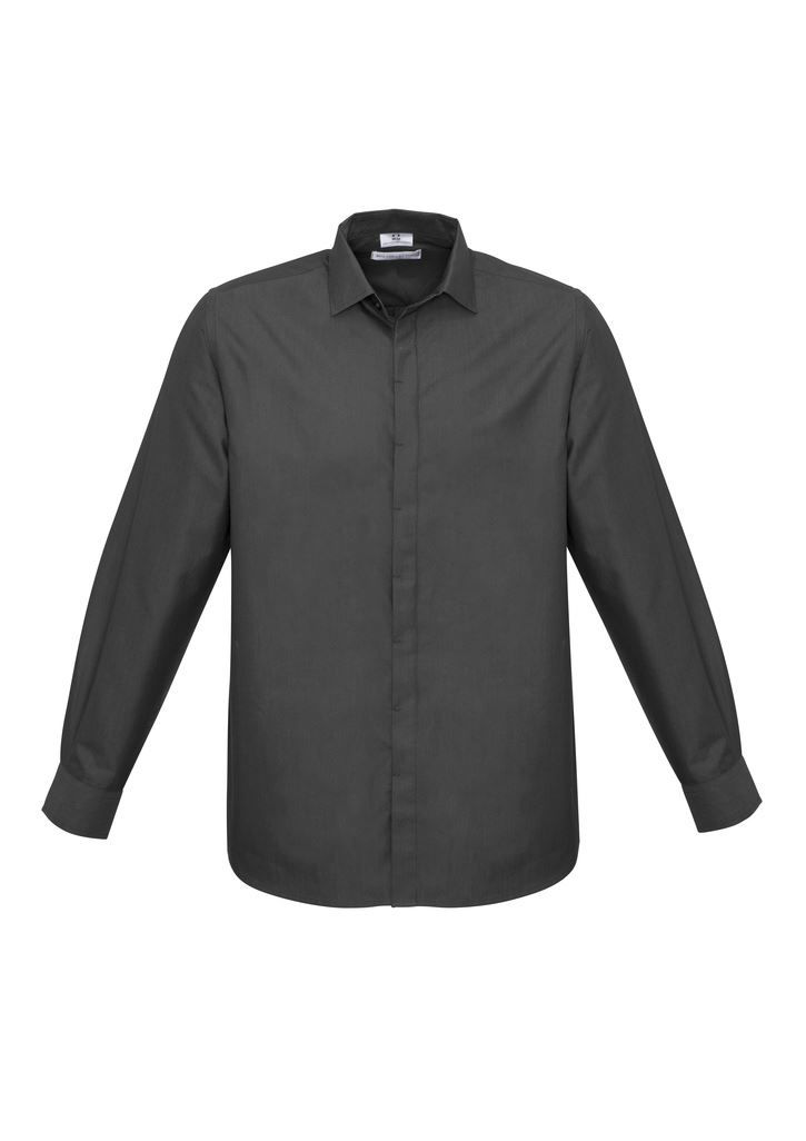 New modern collar for sleek appearance Concealed button placket Twin-back shoulder pleats for movement Adjustable two button cuff Curved hem - can be worn in or out Mens style includes loose pocket