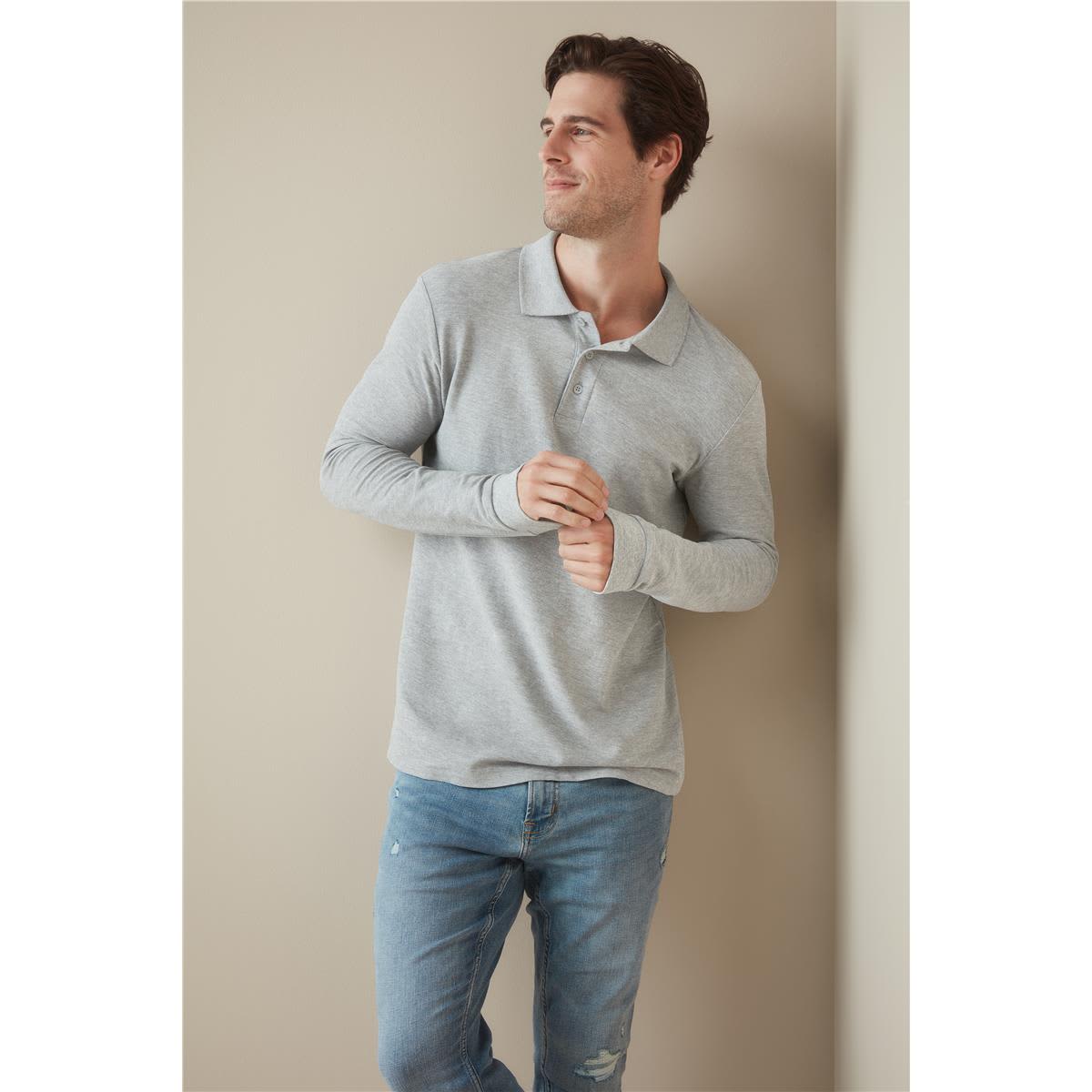 Soft single jersey long sleeve polo shirt for men, with a pleasing piqué look, rib collar, cuffs on sleeves and 3 tone-on-tone buttons. Specifications * Fabric: 100% ring-spun cotton; single jersey, piqué-look * (GYH: 85% cotton, 15% viscose) * Weight: 170 g/m² * Fit: Normal Fit * Sizes: S-2XL * Care Instructions: Washable at 40°C * Other Features: 3 tone-on-tone buttons, cuffs on sleeves, neck tape, side seams, size and care label in the collar