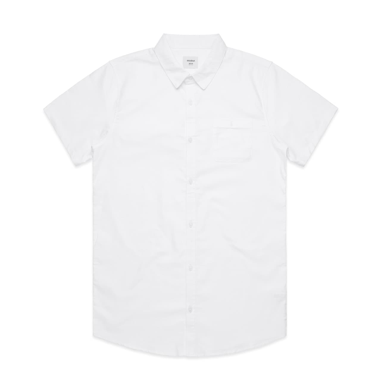 Short sleeve button up shirt, button close chest pocket, clear buttons, side seamed, back yoke, preshrunk to minimise shrinkage