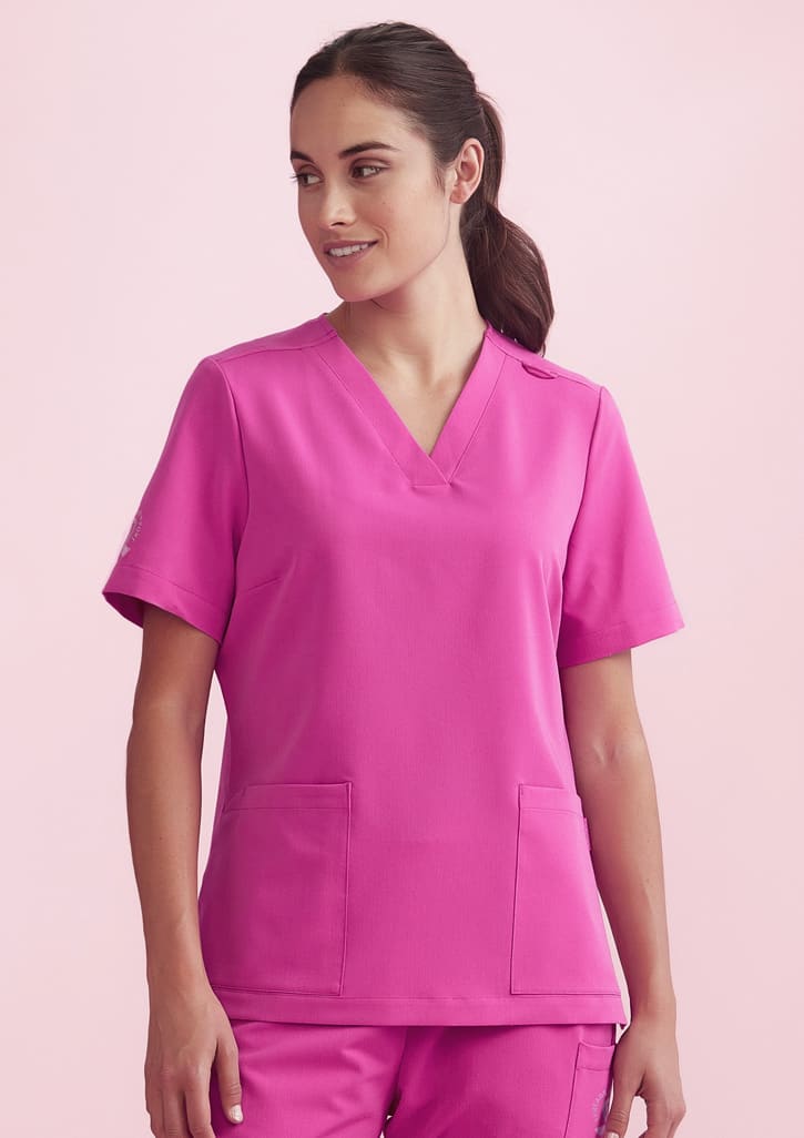 Features: 2 Hem pockets Pink Ribbon embroidery on right hand sleeve All stress points bar-tacked Utility loop on left shoulder Functional side splits to allow easy access into pant pockets and movement Straight front and back hem Modest v-neckline Fabric: 77% Recycled Polyester 19% Viscose 4% Elastane Conscious product choice, with 77% made from post-consumer recycled polyester. This includes recycled plastic bottles, used clothing, and other polyester materials collected from waste or landfills. Easy-care, wash and wear performance fabric for the most demanding of environments. Suitable for warmer climates. Soft against the skin - camisoles/t-shirts underneath is not required. Sizes: XXS – 3XL Cares: Machine washable with like colours, inside out - to hold vibrancy of colours. Do not bleach, do not tumble dry. Cool iron if required, dry cleanable. Quick drying.