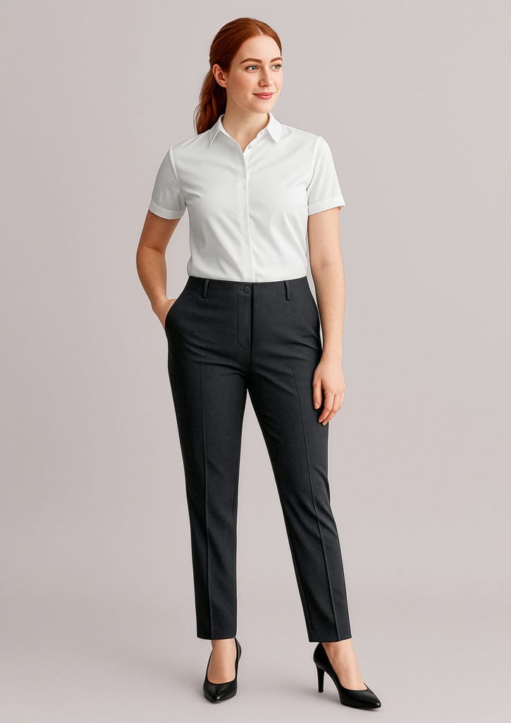 Features: Perfect for those after a slimline pant with the added comfort and movement of an elastic back waistband. Fabric: 79% Polyester 17% Viscose 4% Elastane A lightweight easy care fabric that is soft, and durable. Contains stretch for comfort and Viscose for breathability. Suitable for both functional and corporate roles. Sizes: 4 - 26 (AUS/NZ)